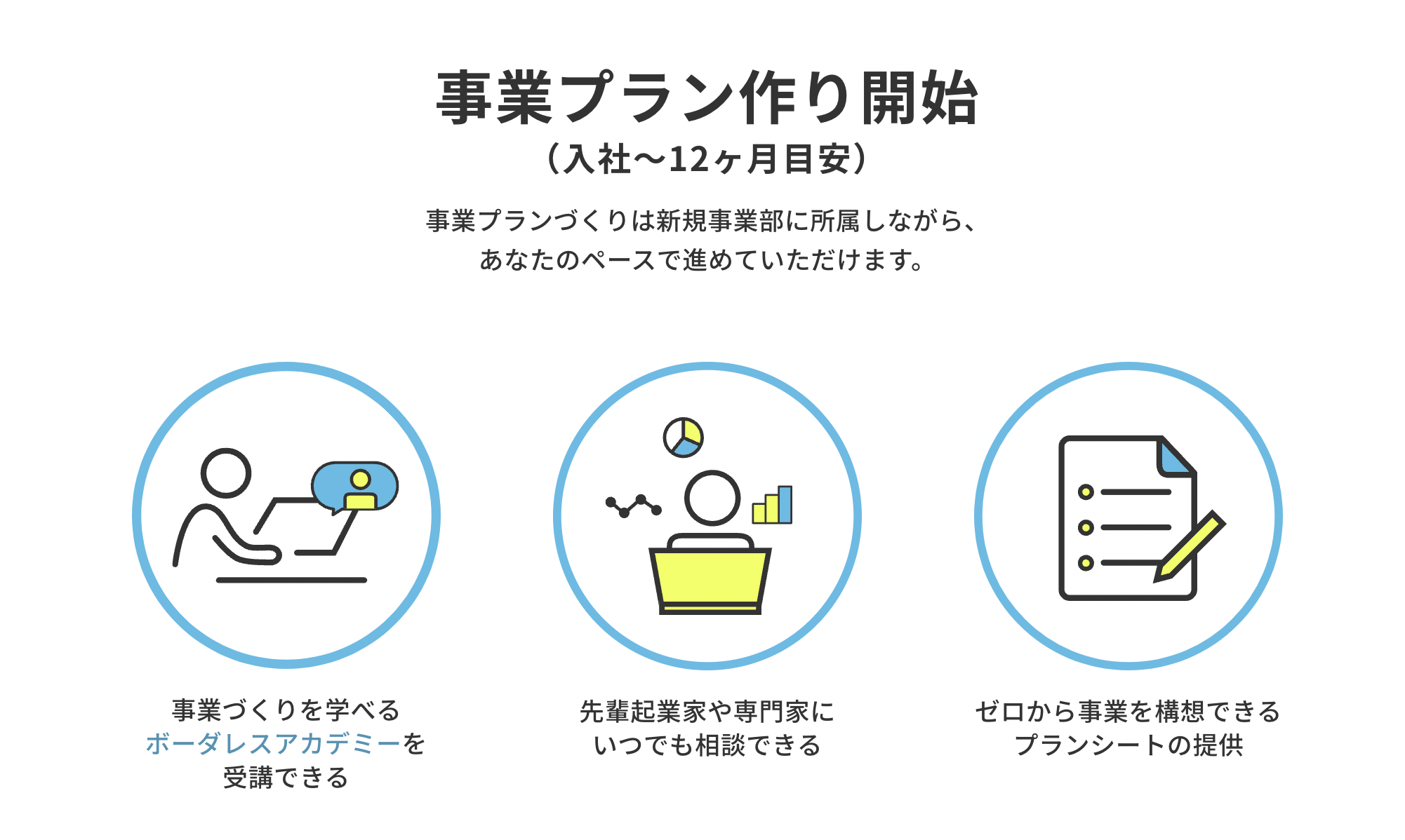 ビジネス経験がない方でも、最短入社4カ月から「自分が解決したい社会問題」に取り組むための新規事業を立ち上げ、事業代表として問題解決に取り組むことができます。