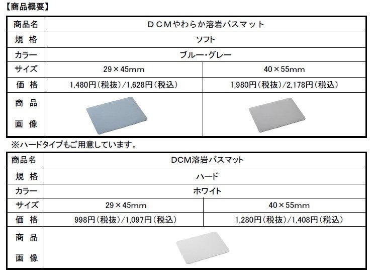 DCMでは これまで 様々なバスマットを販売しご好評をいただいて い ます。そのような中で、布製のバスマットなどは髪の毛やホコリがたまってしまいお手入れが大変との声や 、乾燥に時間を要し、菌の増殖や臭いなど衛生面で気になるという声をいただいています。そこで今回、DCMは吸水性や柔らかさを兼ね備えた「DCMやわらか溶岩バスマット」を発売します。溶岩素材を使用したソフトタイプのバスマットは表面がさらっとしているためホコリなどが付着しにくく、吸水性に優れています。やわらかいので冬場も冷感が伝わりにくく 、 踏み心地よくご利用できます。多少の凹凸がある場所に設置しても割れる心配もありません。