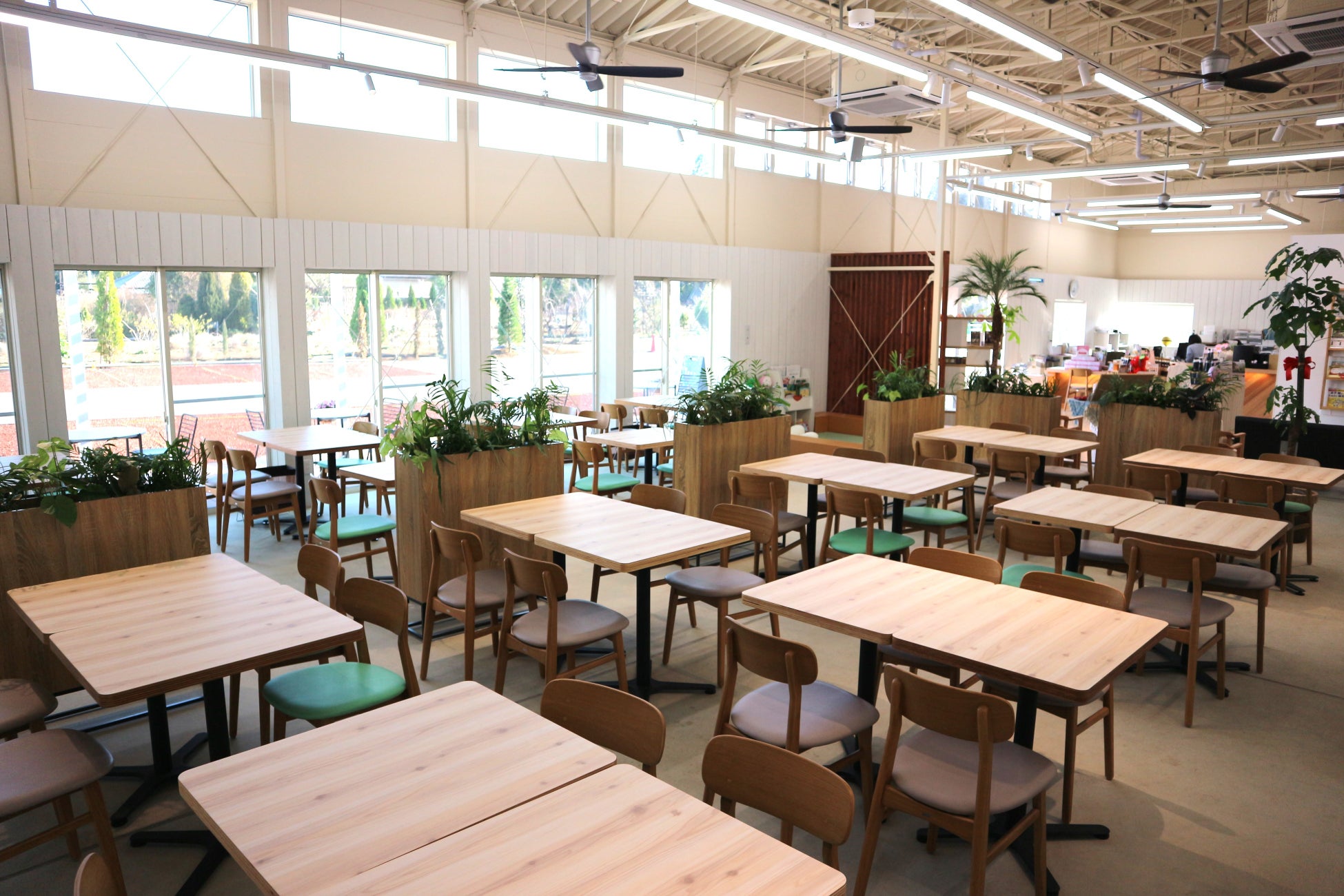 倉庫をリノベーションして建設した食堂内には、キッズコーナー、授乳室兼礼拝室、ユニバーサルデザイントイレなどを設置。