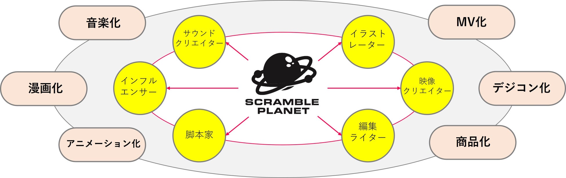 『サウンドクリエイター』×『イラストレーター 』×『インフルエンサー』など、様々なクリエイターを掛け合わせて音楽コンテンツを創出いたします。音楽(音・歌詞)+ 絵画(イラスト・動画)+ 物語(ストーリー・世界観)を紡ぎ合わせ、音楽から生まれた新しい『原作 IP』をTikTok・YouTubeから盛り上げ、メディアミックス・プロダクトを通じてIPの最大化を目指し、SCRAMBLE PLANETが手がける音楽コンテンツから次なるトレンドを生み出していきます。