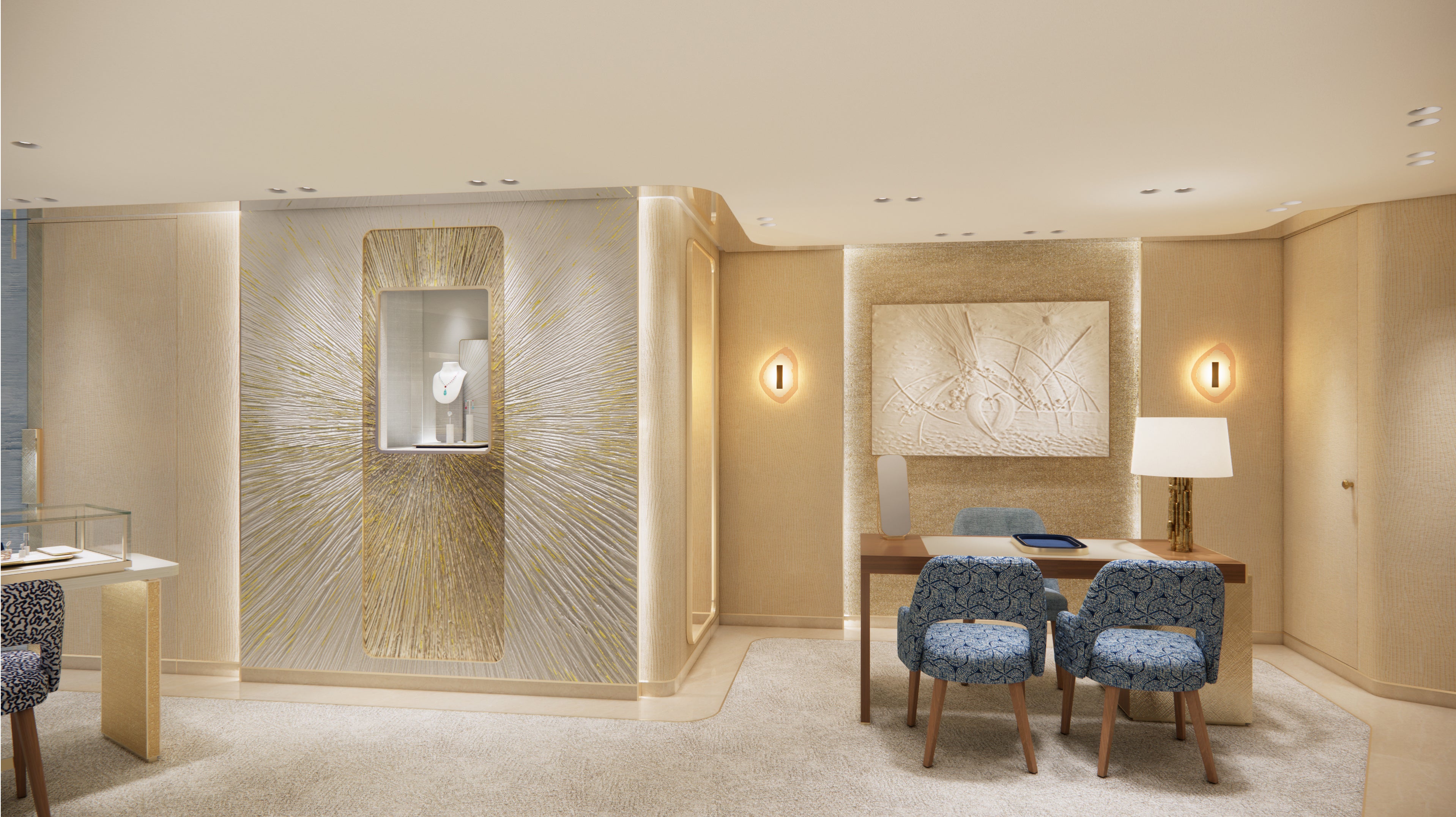 店内のインテリアは、自然主義のジュエラーとしての哲学を反映し、人と自然の永続的かつ根源的な関係性から着想を得てデザインされています。柔らかく有機的なフォルムと、しっかりとした硬質な形状を巧みに組み合わせることで、自然が持つダイナミズムと、秩序ある調和の美しさを表現しています。また、壁面を彩るフレスコ画は、ショーメの象徴的なブルーや豊かな自然のモチーフといった伝統的な要素を、現代的な感性で鮮やかなデザインへと昇華させました。古き良き遺産に現代の息吹を吹き込み、未来へと繋ぐかのように、メゾンの伝統を再構築した空間を演出します。