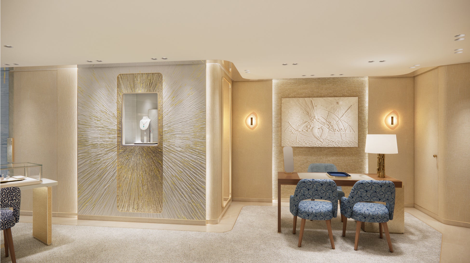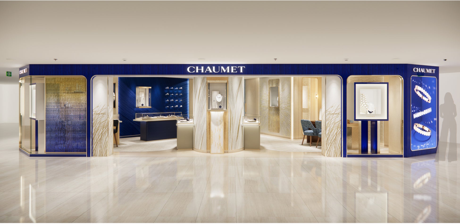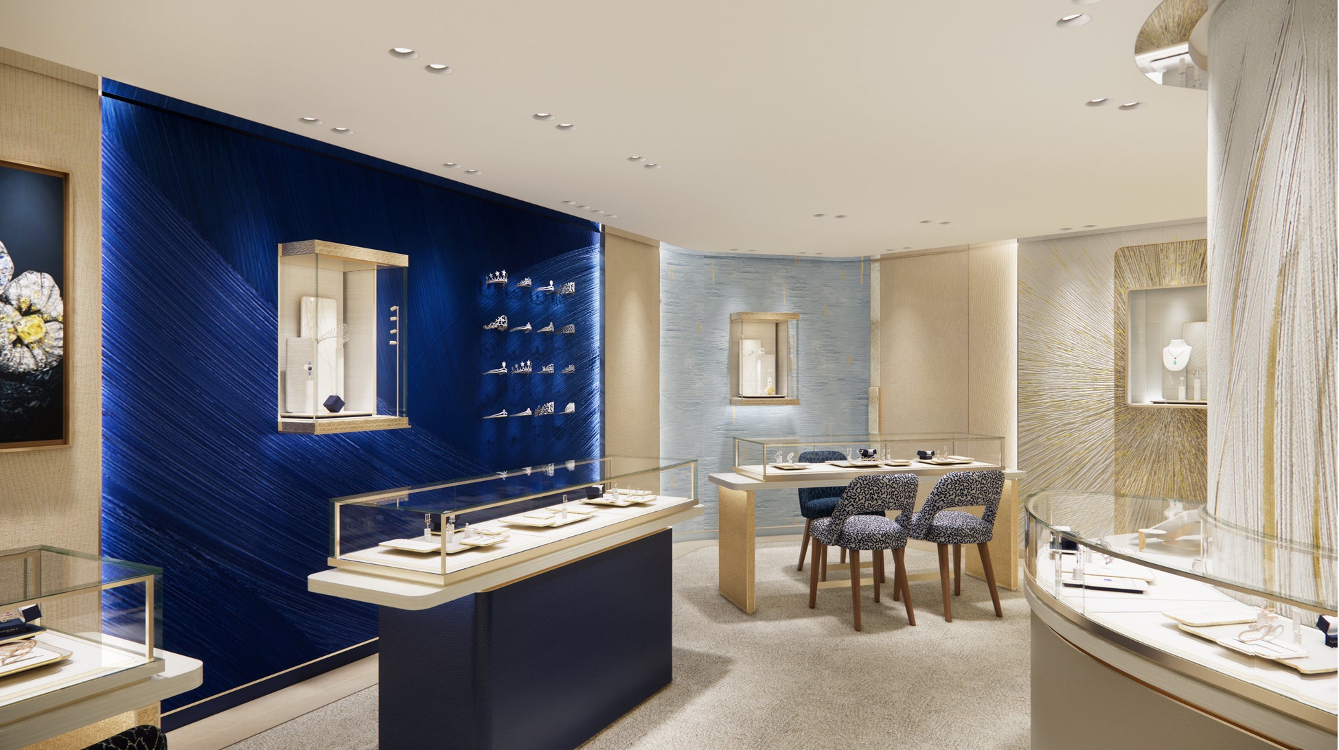 印象的なサファイアブルーのファサードが、ブティック全体を優雅にそして力強く包み込み、解放感に満ちた輝く空間を演出します。ショーメのアイデンティティを象徴するこのブルーは、メゾンが紡ぐ物語を表現しています。光の柔らかな触れ合いによって、繊細な輝きが空間を満たし永続的な美しさを湛えます。