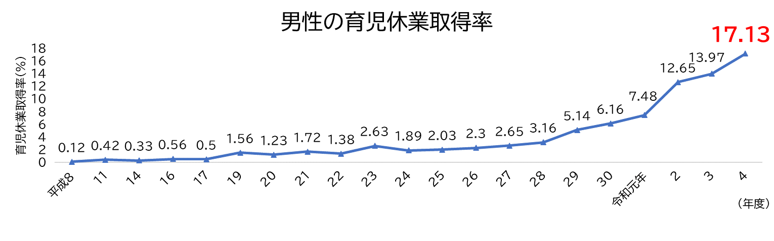 また、厚生労働省「令和4年度雇用均等基本調査」における男性の育休取得率は、17.13%という結果となりました。