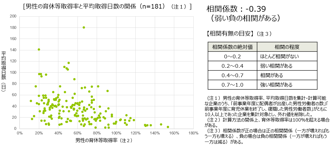 一方で男性の育休等取得率と平均取得日数には、弱い負の相関(男性の育休取得率が高いほど、平均取得日数は短くなる)が見られました。