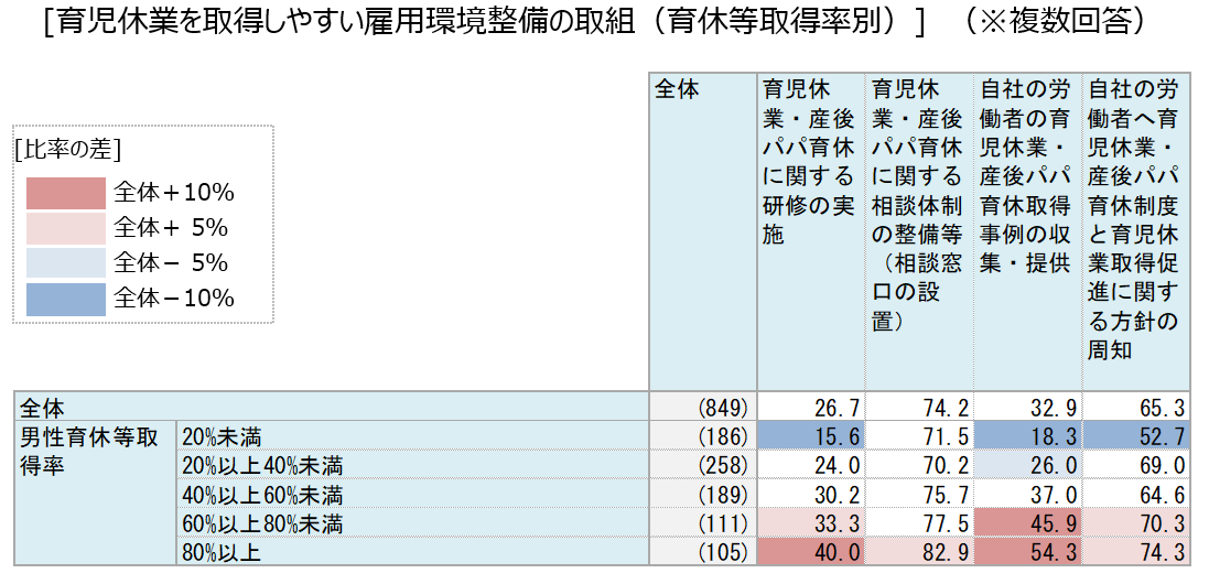 育児・介護休業法では「育児休業を取得しやすい職場の環境整備」を企業に義務づけており、その取組状況を育休等取得率別に見ると、男性の育休等取得率の高い(80%以上)企業群では、取得率が低い(20%未満)企業群と比べて、「自社の労働者の育児休業・産後パパ育休取得事例の収集・提供(+36.0%)」や「育児休業・産後パパ育休に関する研修の実施(+24.4%)」の取組割合が高い傾向が見られました。これらの取組が、男性育休等取得率向上に寄与している可能性も考えられます。