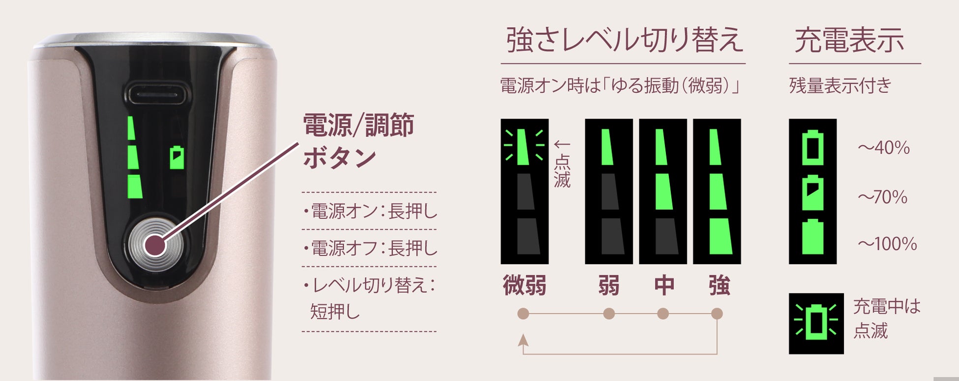 操作に迷わないワンボタンタイプで、使用しながらでも押しやすい位置にボタンを配置しました。2秒以上の長押しで電源のオン/オフができて、押すたびに強さのレベルが変わります。電池残量表示つきなので、突然のバッテリー切れの心配もありません。