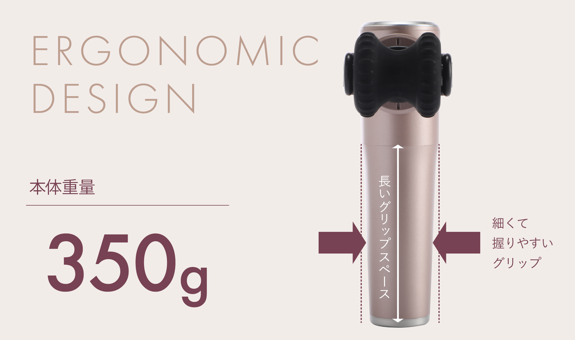 パワーとのバランスも良くしっかりと振動を伝えます。持ち手部分が少し細くなって握りやすく、グリップも長めのエルゴノミクスデザイン。しっかり握れるので振動でブレたり重心が不安定になりにくく、安心して使えます。