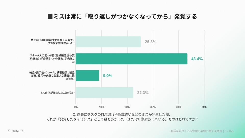 製造業におけるタスク漏れや認識違いが発覚するタイミングは、「仕様確定後や契約直前(43.4%)」、さらには「納品・完了後(9.0%)」と、半数以上の52.4%が致命的な段階に集中しています。これは全業種平均(48.8%)を上回る数値であり、プロセスの後半でミスが発覚するほど手戻りコストが跳ね上がる製造業特有の危うさが浮き彫りとなりました。