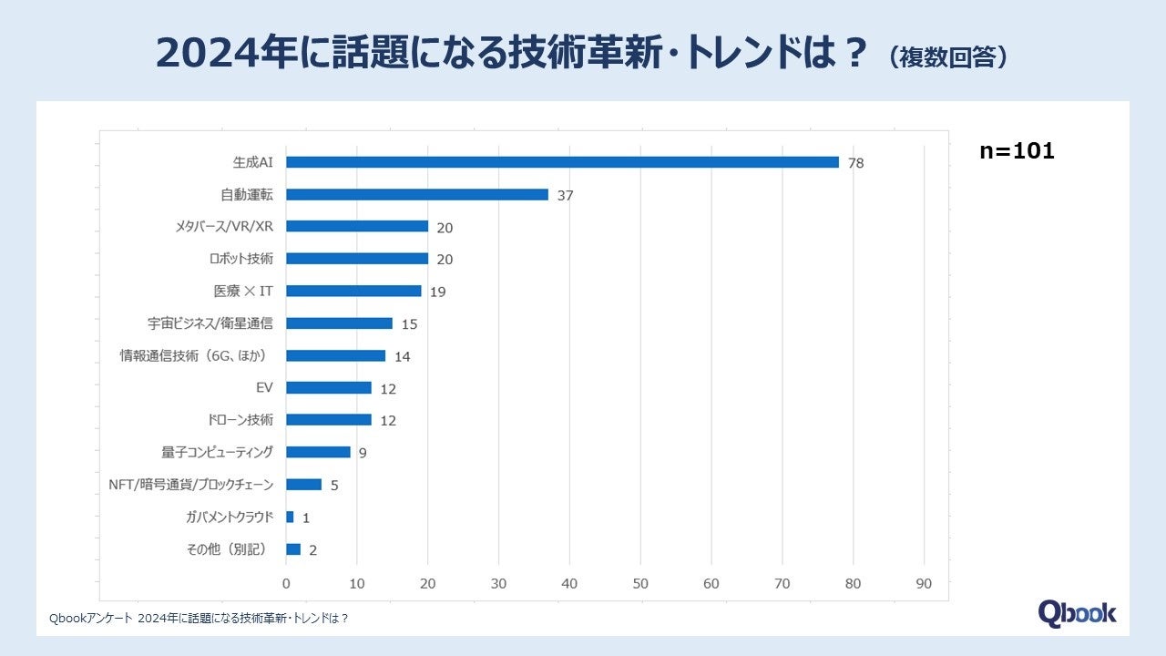 最も多かった回答が「生成AI」で78件。続いて、「自動運転」が37件、「メタバース/VR」・「ロボット技術」が20件、「医療IT」が19件、「宇宙ビジネス/衛星通信」が15件、「情報通信技術(6G、ほか)」が14件、「EV」・「ドローン技術」が12件と続きました。