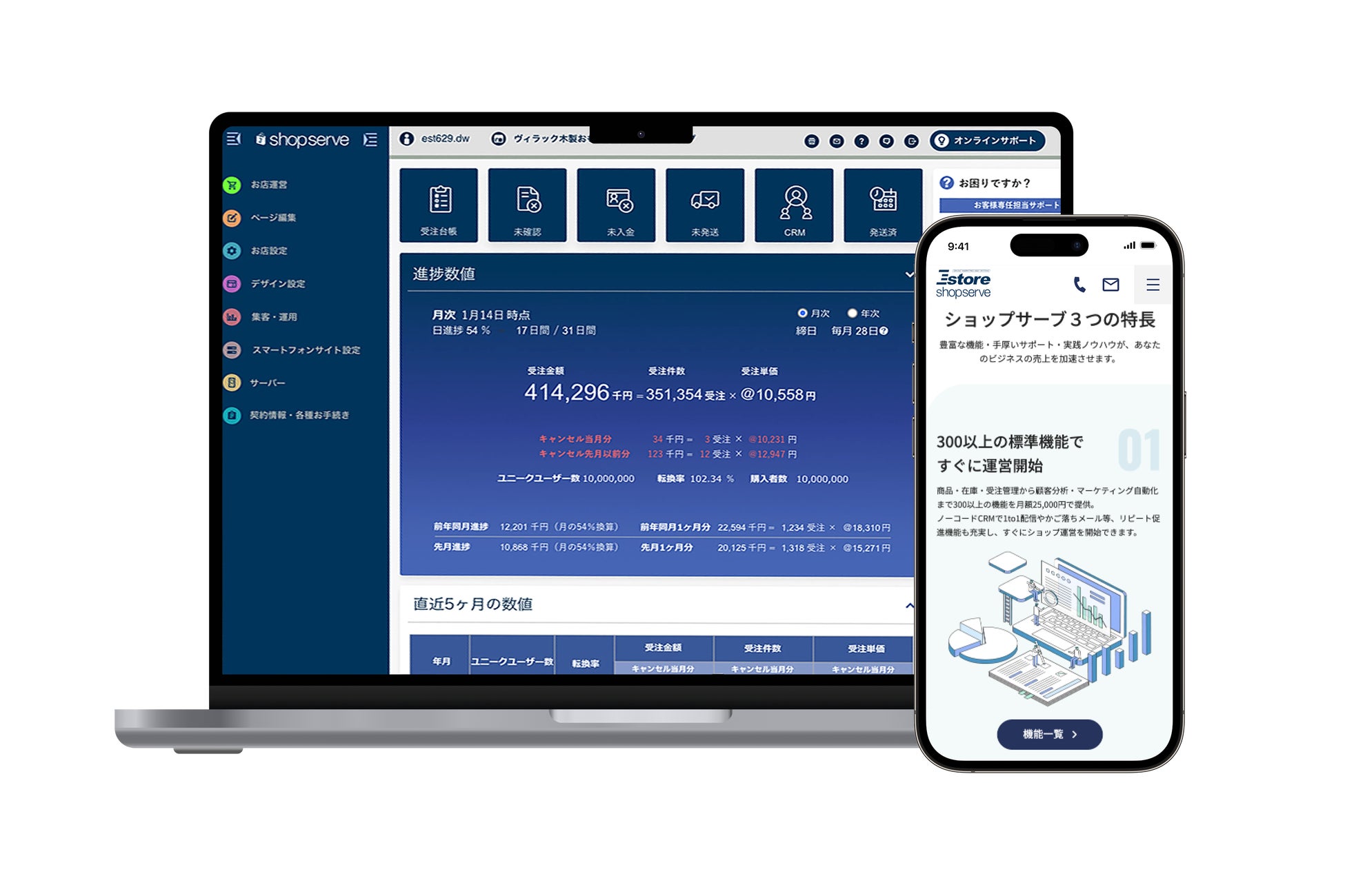 「Eストアーショップサーブ」は、立ち上げから運用・成長までを支援する伴走型ネットショップ構築システムです。全国の中小から大手まで幅広い企業様にサービスを提供しています。高い安定性と柔軟性を備えたシステム設計に加え、専任サポート担当による運用支援や、CRM機能を活用したリピート施策の強化など、店舗の成長と効率的な運営を支える環境が整っていることが特長です。また、業界最多水準のAPIを備えており、各種外部ツール・サービスとのダイレクトな連携が可能なため、追加のカスタマイズ開発を行うことなく、柔軟な拡張が可能です。