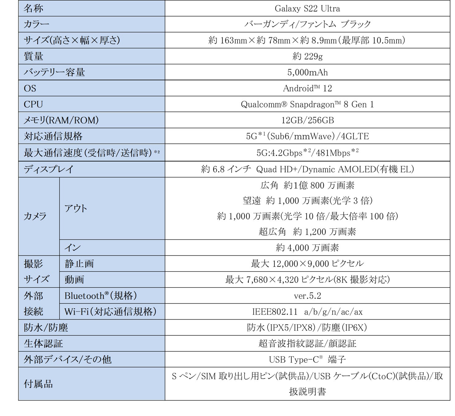 「Galaxy S22 Ultra」の特長は以下のとおりです。