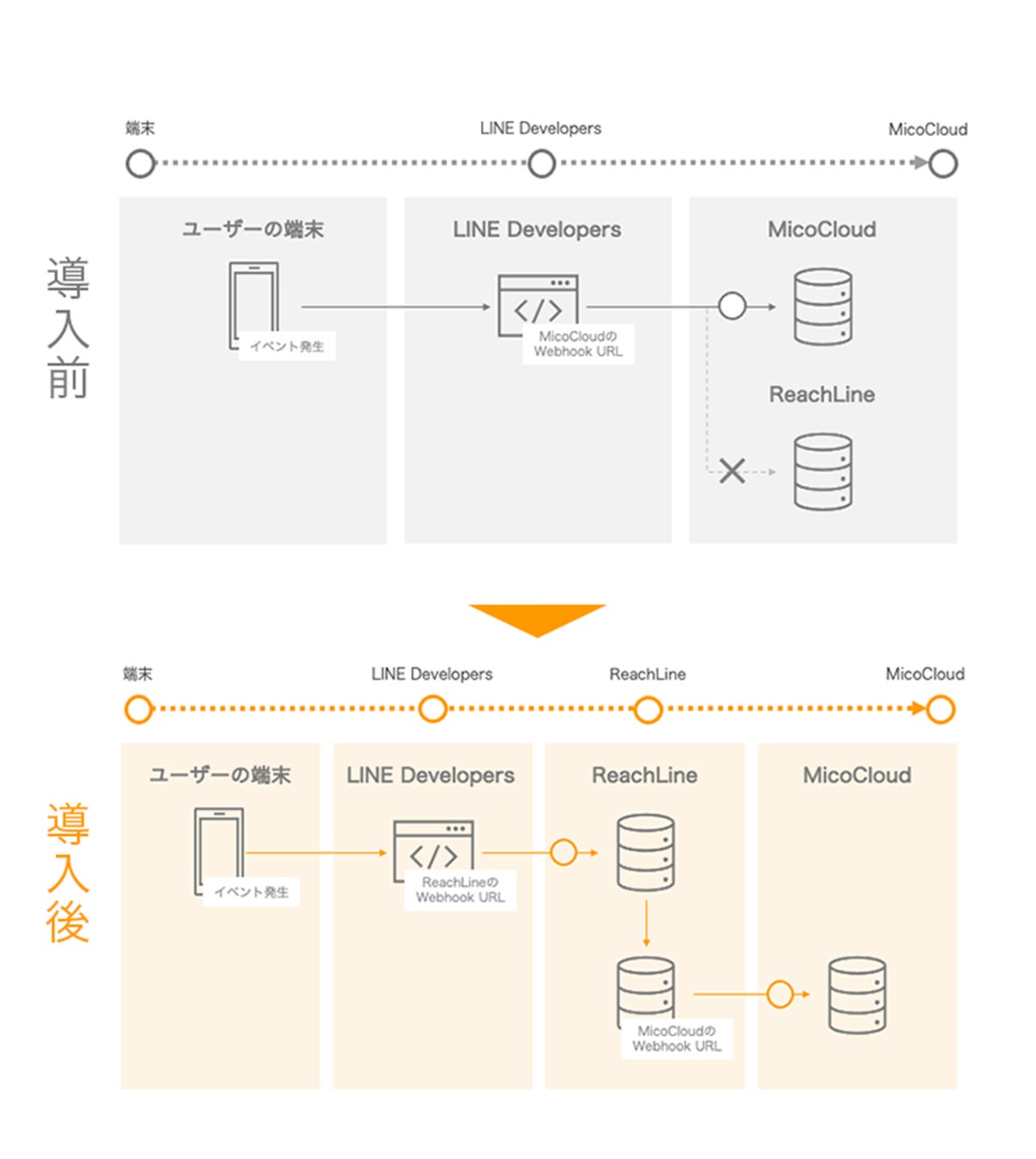 この度の連携によって、当社のLINE通知メッセージ配信ツール「ReachLine」で、友だち未登録のアカウントにもメッセージを送信しつつ、友だち追加以降は「MicoCloud」のセグメント配信機能等を用いてユーザー一人ひとりに寄り添ったメッセージ配信を行うことで、よりユーザーとのエンゲージメントを高めることに繋がります。