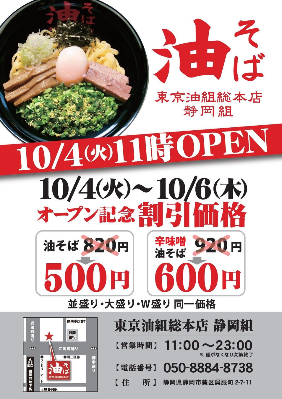 【静岡県 “初” 出店!】油そば専門店『東京油組総本店 静岡組』10月4日(火)オープン!