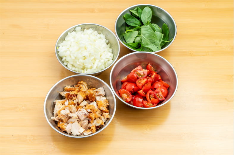 2:タマネギは皮をむき粗みじん切り、トマトは粗く刻む。バジルはさっと洗って水気をふきとり、軸を取り除いて食べやすい大きさにちぎる。