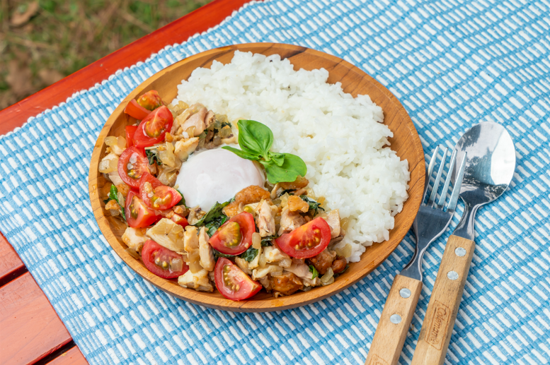 市販の温泉卵を使用して手軽につくるガパオ風ライス。ちょっとクセのあるナンプラーを使わず、醤油とハチミツで味付けするので親しみやすい味わいです。