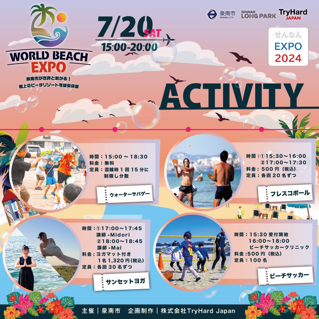 泉南市と株式会社TryHard Japan(所在地:大阪市中央区)は、2024年7月20日(土)にSENNAN LONG PARK(所在地:⼤阪府泉南市)にて開催予定の、世界のビーチを疑似体験できる「WORLD BEACH EXPO」のコンテンツ詳細を発表いたします。【入場無料】