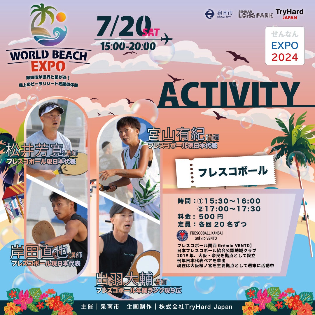 ブラジル発祥のビーチスポーツであるフレスコボールは、激しい羽根つきのようなプレーで、日本人にもなじみやすく気軽にお楽しみいただけます。今回はフレスコボール関西Grêmio VENTOから日本代表選手が講師としてお越し頂きます。この機会にぜひお試しください!
