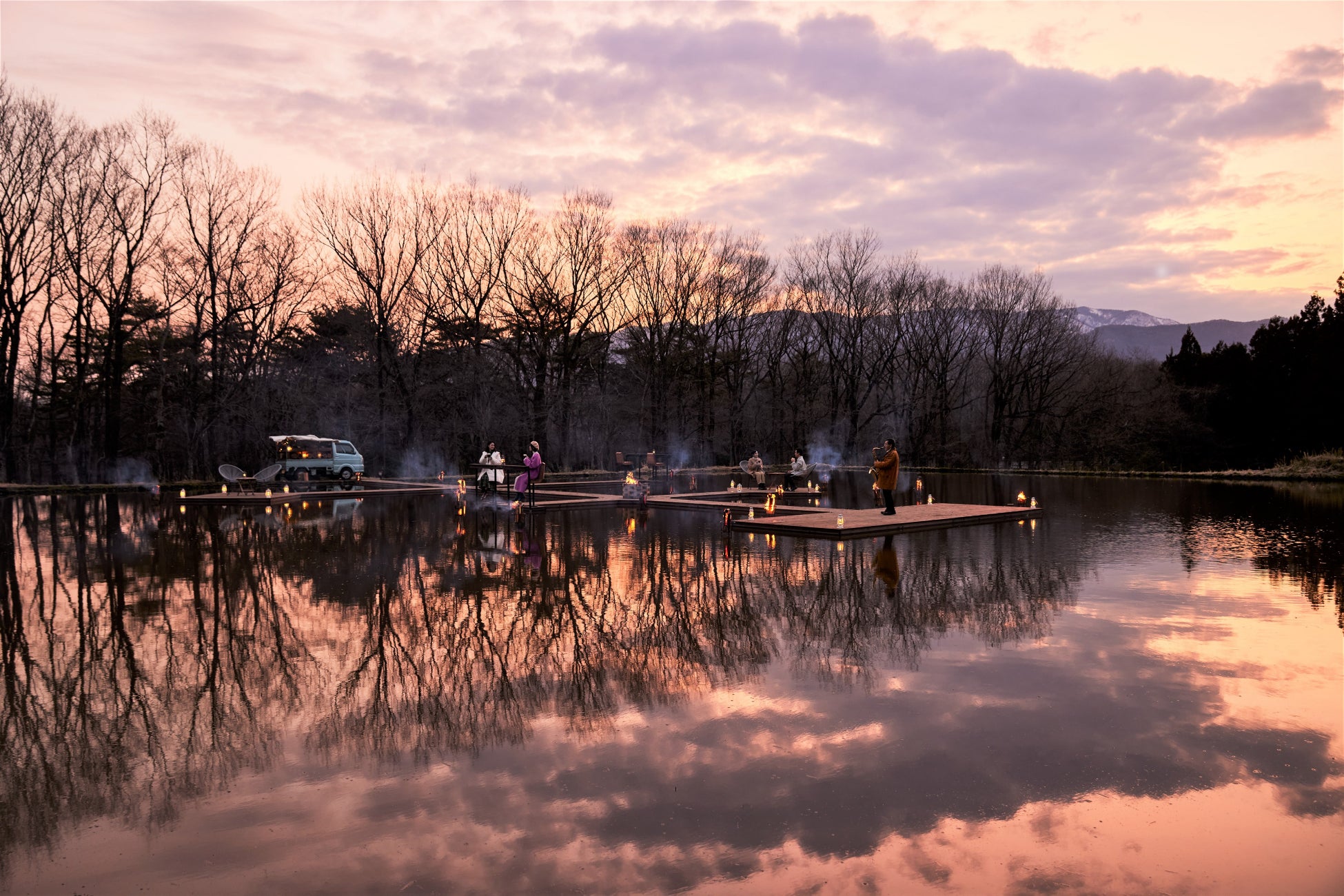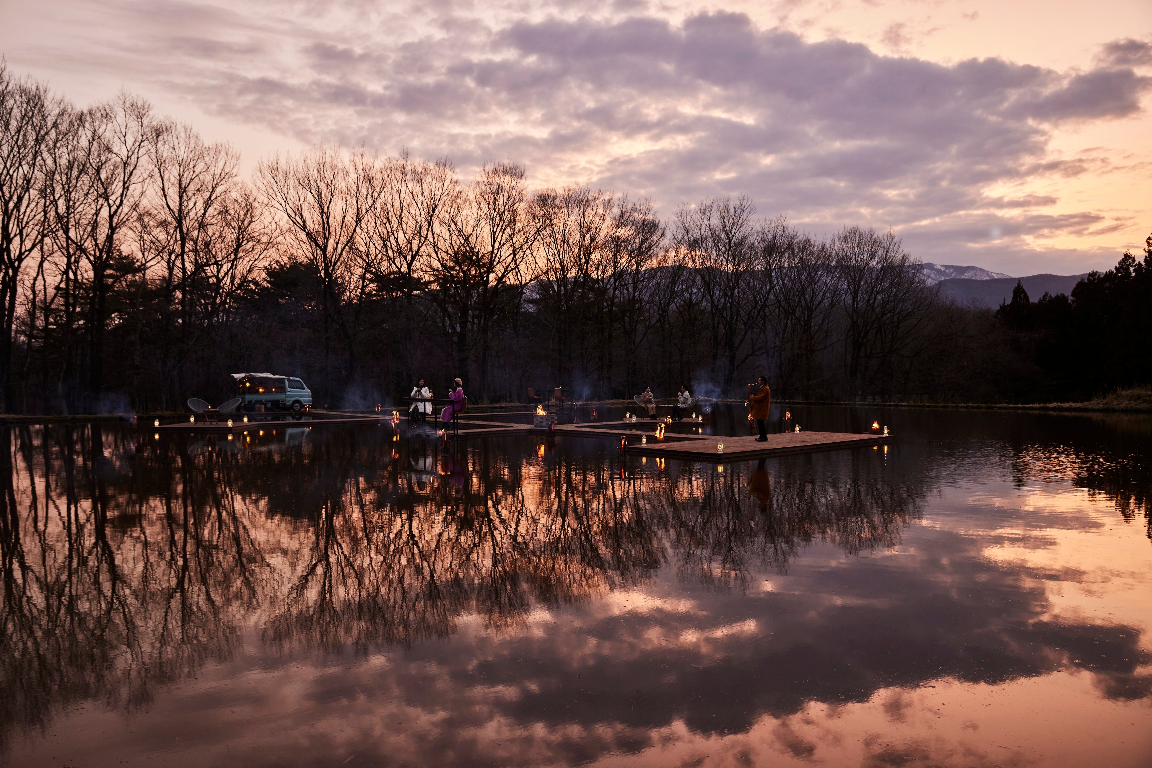 アグリツーリズモリゾートをコンセプトにするリゾナーレ那須では、冬期湛水という田んぼに水を張る農法を行います。水を張った田んぼには、澄んだ冬の星空や淡く光る客室の灯りが映り込み、幻想的な風景になります。冬の夜にその柔らかな光に包まれながらゆっくりと寛いでほしいと思い、水上に特別席やシンボルとなる焚火などを設える当イベントを企画しました。