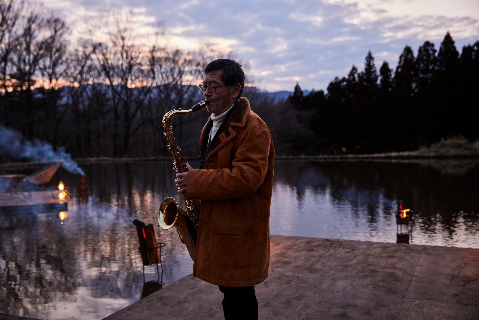 土日、祝日限定で、那須町在住の音楽家による演奏会を実施します。冬の澄んだ空気の中、水上デッキの上で奏でるサックスの美しい音色が水田に響き渡る演奏会です。