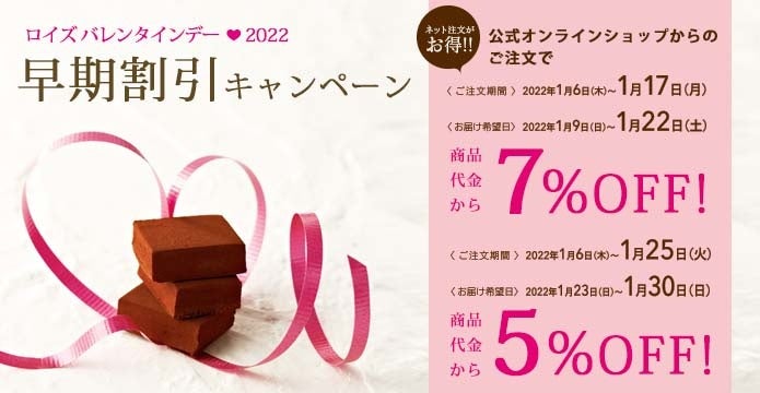 - 【通信販売 限定】最大7%OFF!ロイズ バレンタインデー2022 早期割引キャンペーン開催中