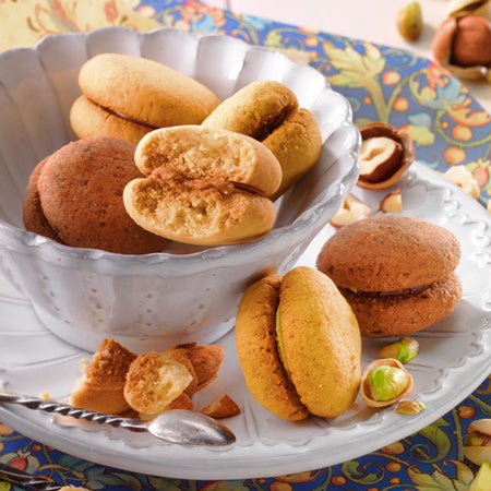 しっとりほろほろとした食感の小粒のクッキーに、味わい豊かなナッツのペーストを入れたリッチなチョコレートクリームをサンド。3種それぞれに、深みあるナッツの魅力を存分に楽しんでいただけるお菓子です。