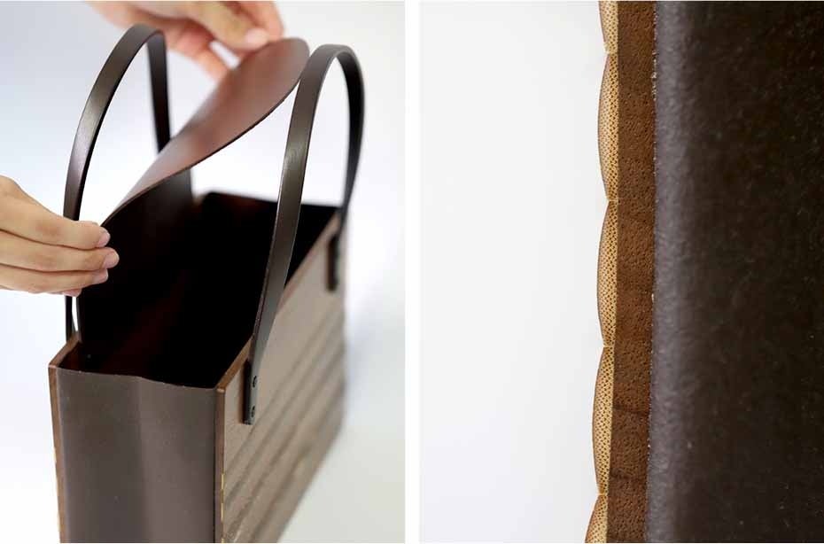 持ち手には、上質な革素材を両面とも表革仕上げで採用。手にしっくりと馴染むよう仕立てられ、使い込むごとに色艶が増し、時間とともに風合いが深まります。着物や洋服に触れても擦れにくいように特注された組ねじの金具や、荷物の飛び出し防止と中身を見えにくくする革のかぶせなど、細部にわたる実用性も追求されています。