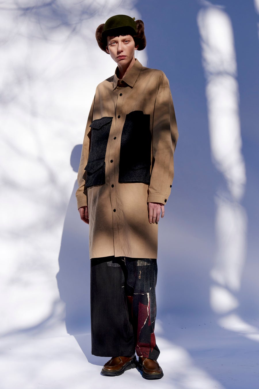 左右異なるフラノウールのデザインポケットが付いたコットン素材のロングワークシャツ。軽めのコートにもなるビッグシルエット。男性が羽織で着られるほどのサイズ感で、オーバーサイズでシャツドレスのような着こなしも可能です。ストレートシルエットのパンツを合わせ、辞書を破ってコラージュしたような柄がユニークなアクセントを加える、ワークウェアスタイル。