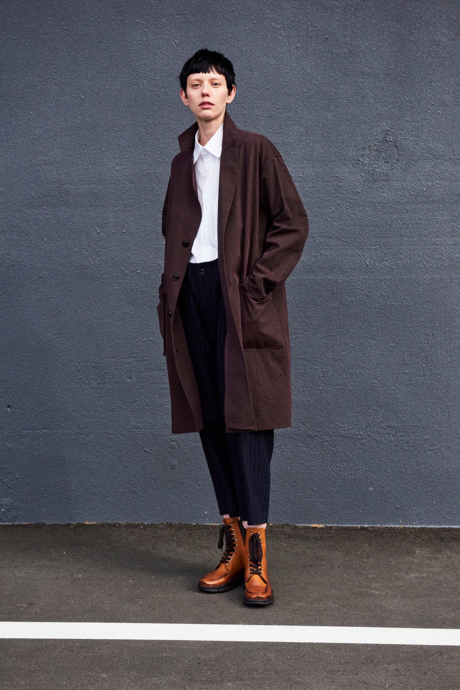 全面ローラープリントによる、顔料のカラーリングで、ゆらぎのある色合いと、経年変化を楽しめるコットン素材のコート。右襟付けが外れたような、ささやかで効果的な崩しが、ミニマルなスタイルに変化を与えます。身頃の幅、アームホールともにやや大きめで肩は自然にドロップショルダーになるモダンなサイズ感のメンズウェアを着たようなシャツに、股上が深めの吊りパンツを合わせた少年のようなスタイルが、女性らしい潔さを引き出します。