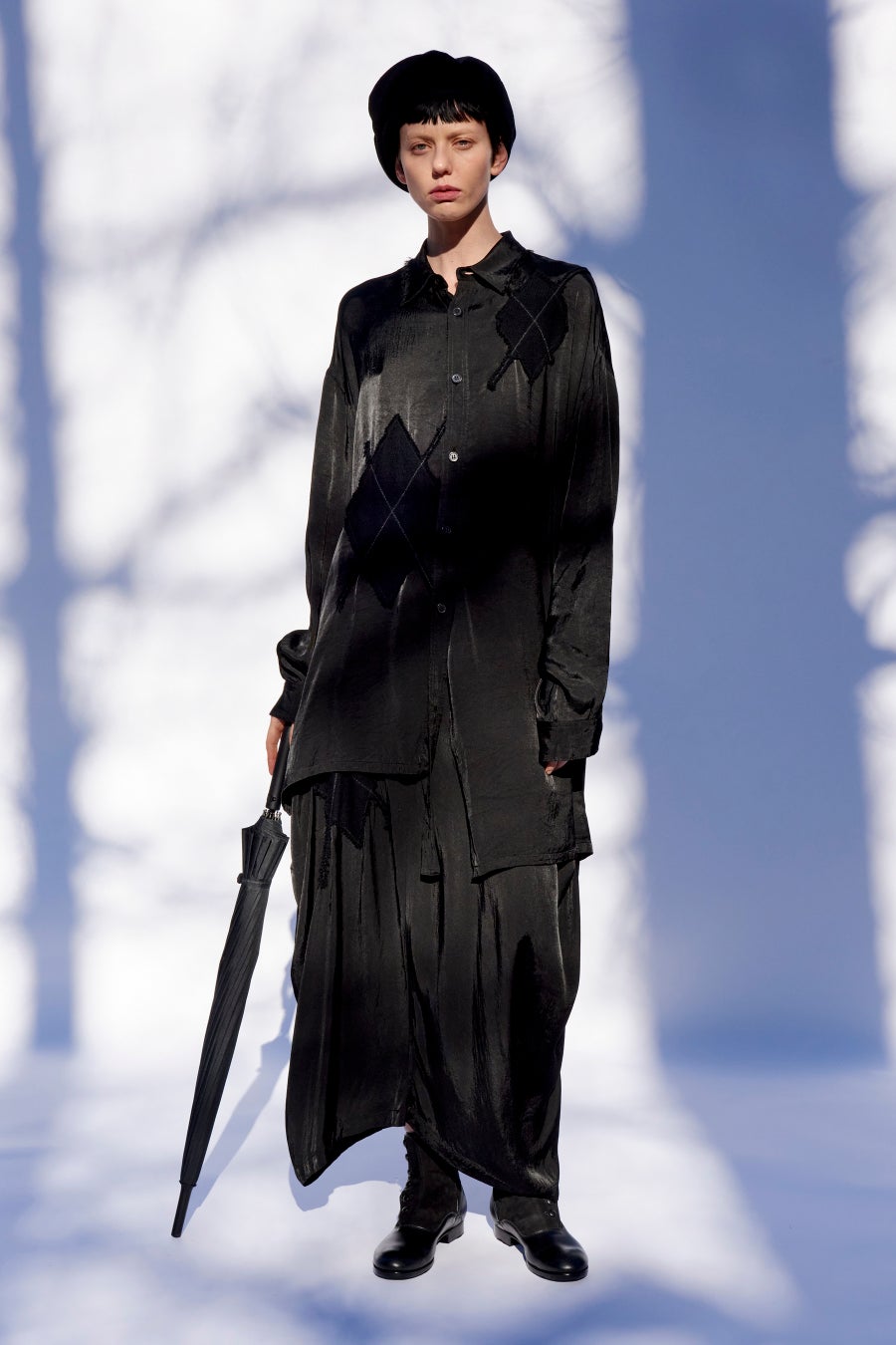 ビンテージライクな粗めのレーヨンサテンで仕立てられた、前立てが裾のあたりで外れたようなアシンメトリーディテールのメンズサイズシャツと、特有のフォルムを持つスカート。サテン生地に、ウールを刺繍機で叩きつけ、一枚一枚手作業で切り落として完成するアーガイル柄は、最後に製品洗いが施されてボロボロの風合いがつくりだされ、全体に馴染んだ印象を生み出しています。クラシックな映画のワンシーンのようなスタイルは、こなれた風合いで、日常を鮮やかに彩ります。