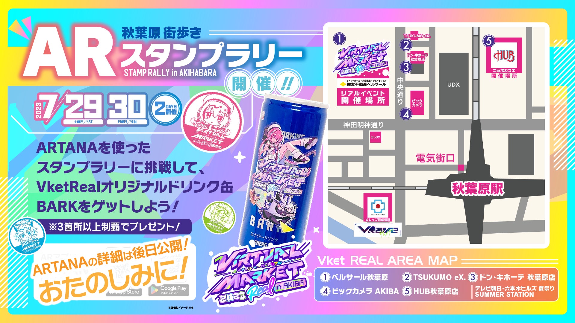 メイン会場ベルサール秋葉原を起点に、「ビックカメラ秋葉原店」、「ドン・キホーテ秋葉原店」、「TSUKUMO eX」、「HUB秋葉原店」を巡るARスタンプラリーを開催!メイン会場で入手できる「ARTANAカード」に記載されたQRコードを各所でスキャンすると、デジタルスタンプをゲットできます。全部のスタンプを集めるとスーパーマーケット「ベルク」のオリジナルエナジードリンク『BARK』 のVketオリジナルデザイン缶をプレゼント!ぜひご参加ください。