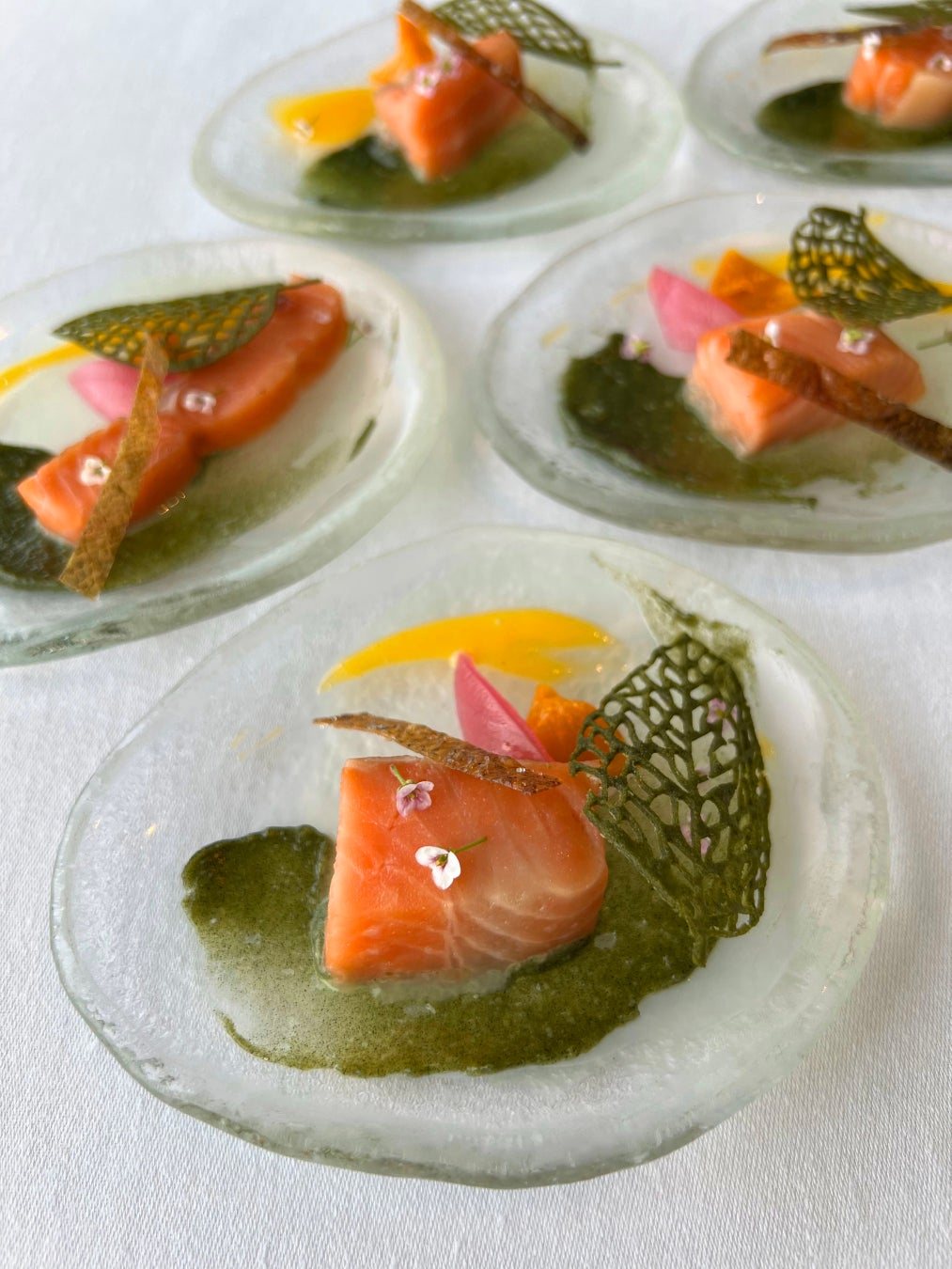多気サステナブルサーモンのくせのない味わいを感じていいただけるよう低温調理を施しました。飼料に含まれている地元の食材の伊勢茶やみかんを使い、サーモンの皮は歯ざわりよく焼き上げ食感のアクセントに加えました。様々な食材を組み合わせることで、「循環」をお皿の中に表現しました。