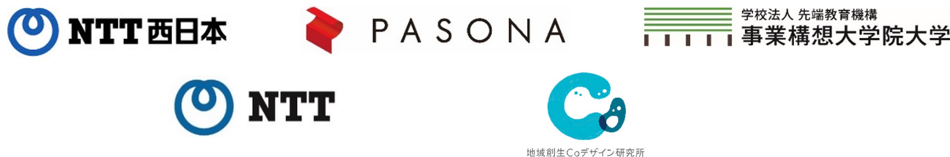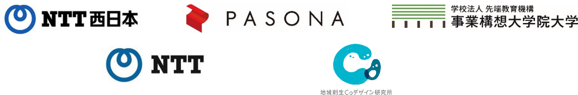 NTT西日本 :ICTソリューションをいかし、地域課題解決を実践 パソナグループ :地域への人材流動を通じ働く機会を創出 事業構想大学院大学 :地域活性化の構想を構築する人材の育成 NTT社会情報研究所 :Social Well-beingを中核とした未来社会のデザインの研究 地域創生Coデザイン研究所:地域や様々な主体と連携し地域活性化シナリオを策定 |