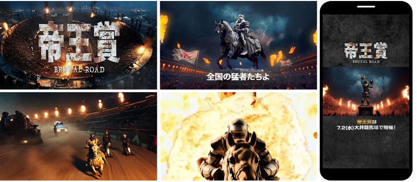 「帝王賞」の名の通り、強大な「帝王」が猛威を振るう架空のアクション映画。予告編仕立ての映像でレース告知を行なっています。フルCGと見紛うような豪華な映像の全てが生成AIによって書き出されており、競馬CMとしてお楽しみいただくことはもちろん、最新技術を駆使した革新的な映像表現にもぜひご注目ください。