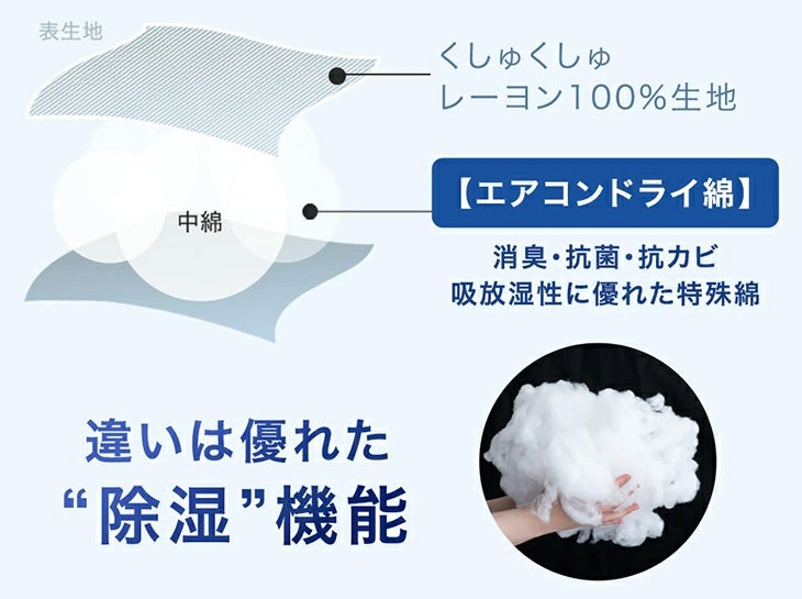 春先や秋など、比較的涼しい季節でも快適にお使いいただける「とろ~り面」には、なめらかな肌触りが特長のレーヨン生地を採用しています。レーヨンは天然原料を由来とする再生繊維で、熱伝導性が高く、触れるたびにひんやりとした感触を味わえます。さらに、綿よりも優れた吸湿性と通気性を備えており、「エアコンドライ綿」の優れた除湿力と相まって、ベタつきのない快適な寝心地を実現しました。