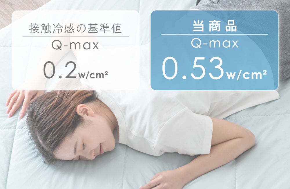 触れたときのひんやり感の指標となる「Q-max値」が一般的な接触冷感の基準値で0.2W/cm²に対して本製品は0.53W/cm²と2.5倍以上の数値となっており強いひんやり感をご体感いただく事ができます。