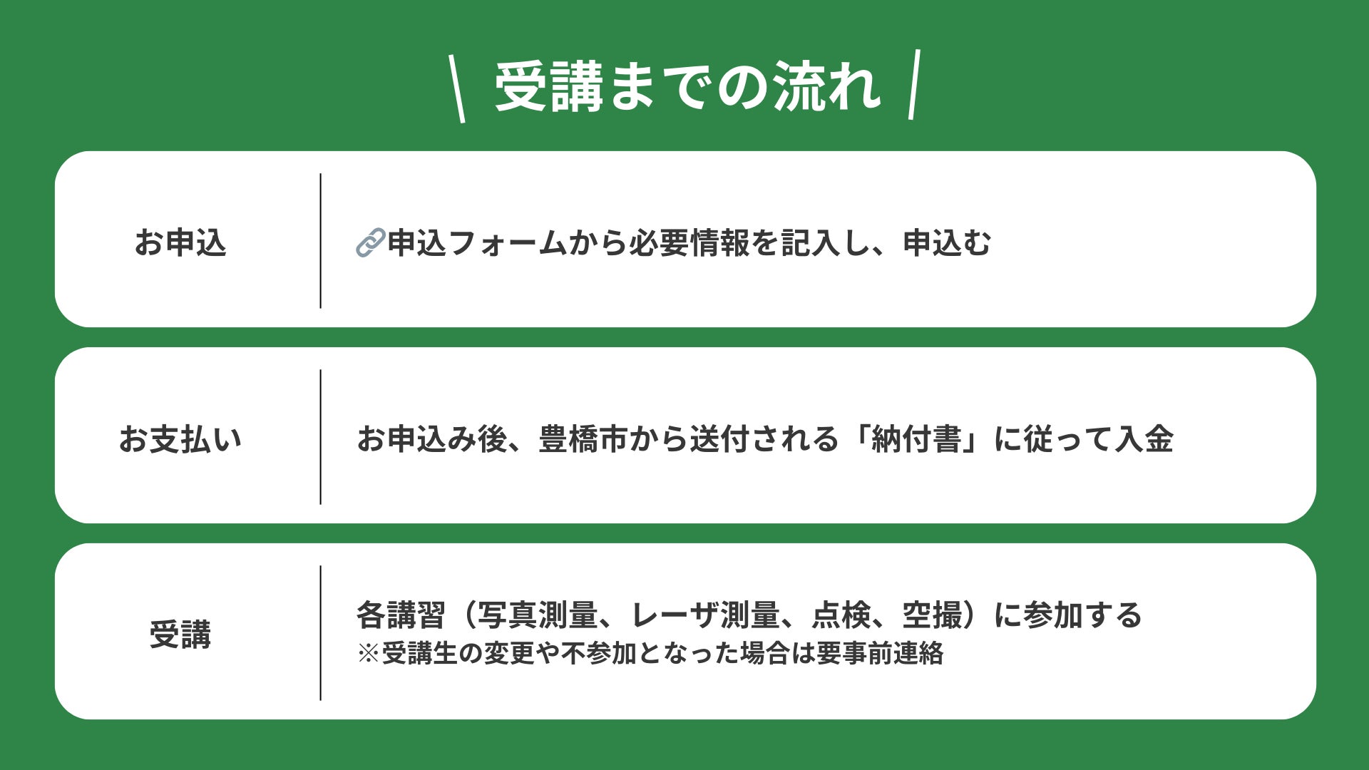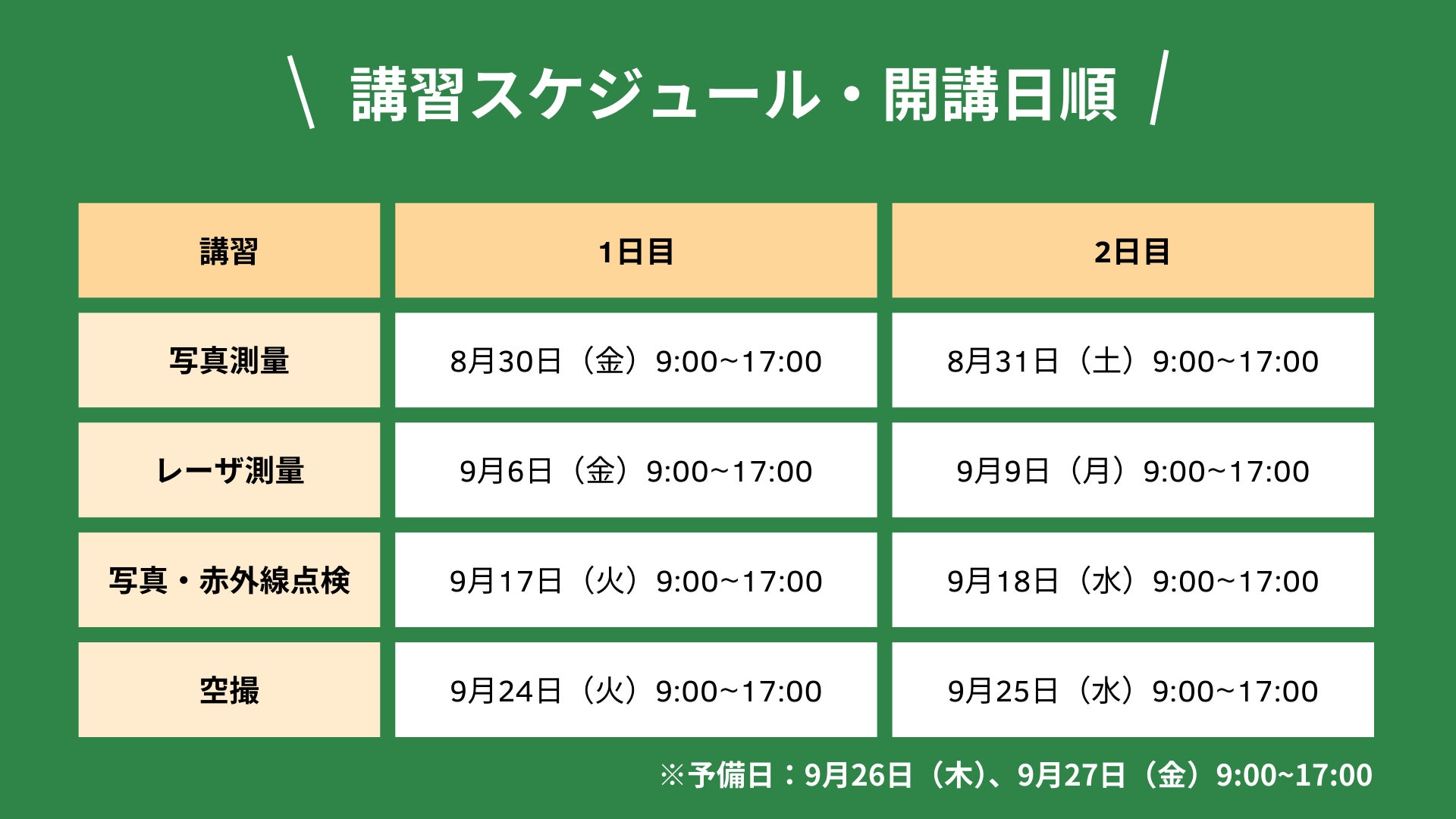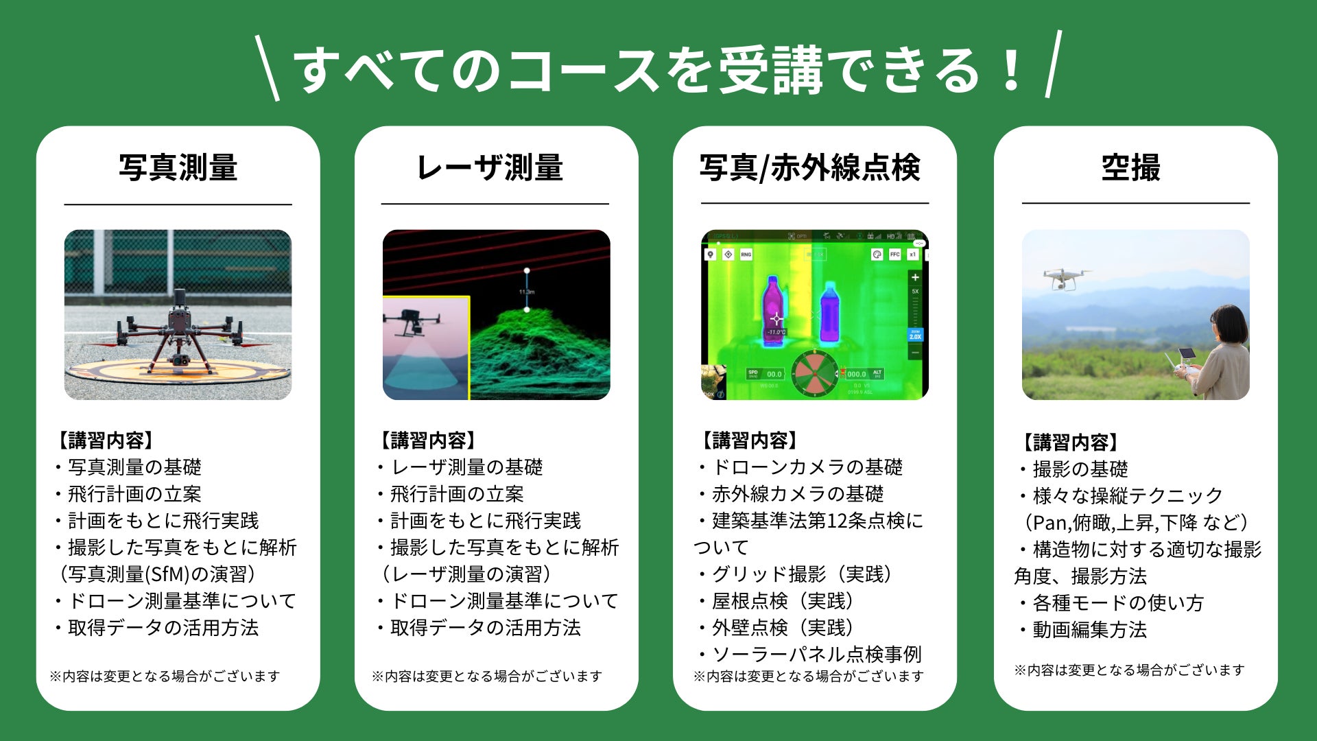 写真測量、レーザー測量、写真・赤外線点検、空撮といったコースをすべて学ぶことができるカリキュラムとなっています。すべてのコースを受講完了後、修了証書をお渡しいたします。