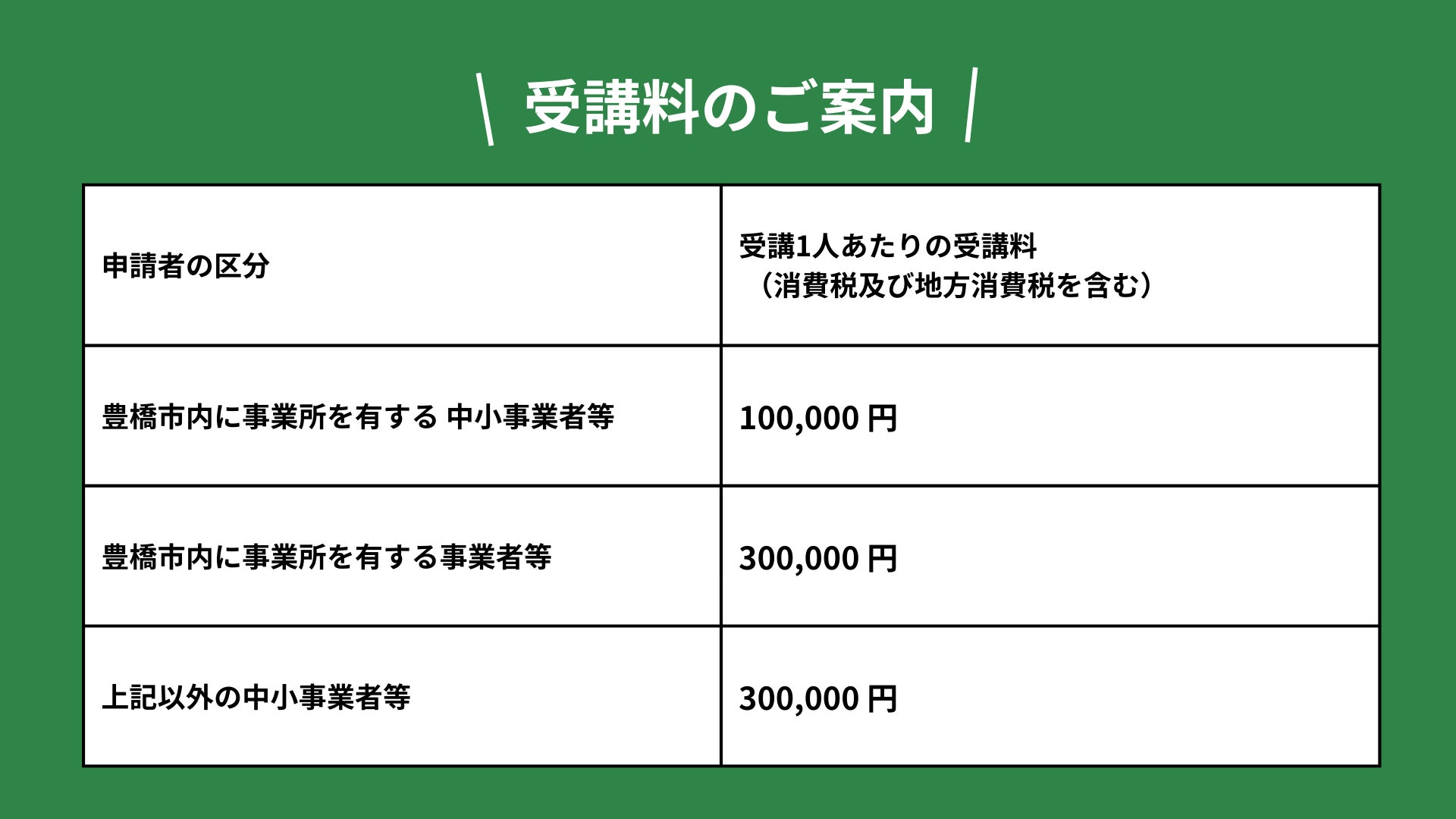 要件を満たしている方は、すべてのコースをなんと10万円/人または30万円/人で受講することが可能です。