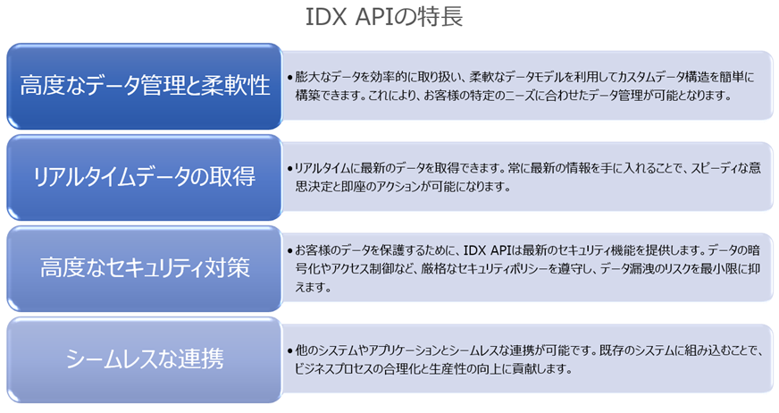 IDX APIの特長として、高度なデータ管理機能、リアルタイムデータの取得、高度なセキュリティ対策、シームレスな連携などが挙げられます。膨大なデータを効率的に取り扱う柔軟なデータモデルや、最新のセキュリティ対策を導入した安心してデータを活用できる環境が整備されています。
