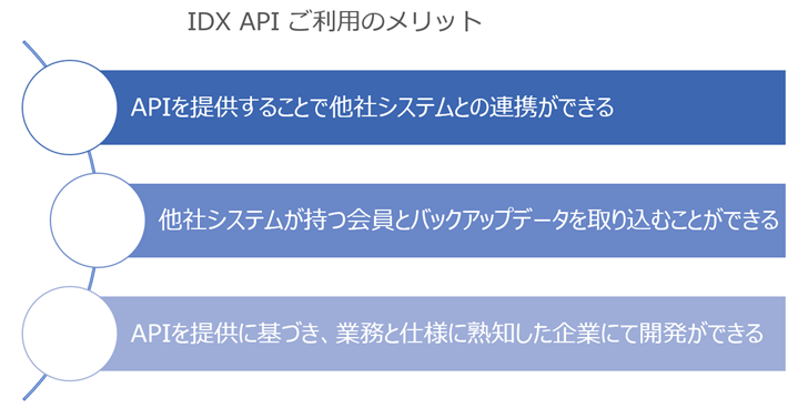 IDX APIのご利用により、他社システムとの連携が円滑化し、会員データやバックアップデータを有効活用できることは、お客様のビジネスにとって大きな利益があります。