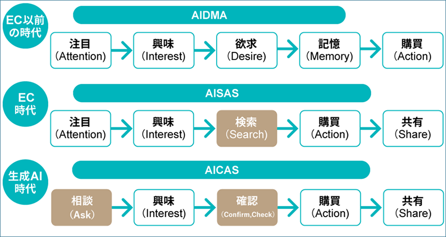 従来の「AIDMA」「AISAS」が Attention(注目) を起点としていたのに対し、「AICAS」は Ask(相談・質問) を起点とする点に特徴があります。消費者は、情報過多の環境下で選択肢が多すぎて「選べない」というストレスを抱える中、生成AIに「おすすめを教えて」と相談・質問を投げかけるところから購買行動をスタートさせるようになりました。