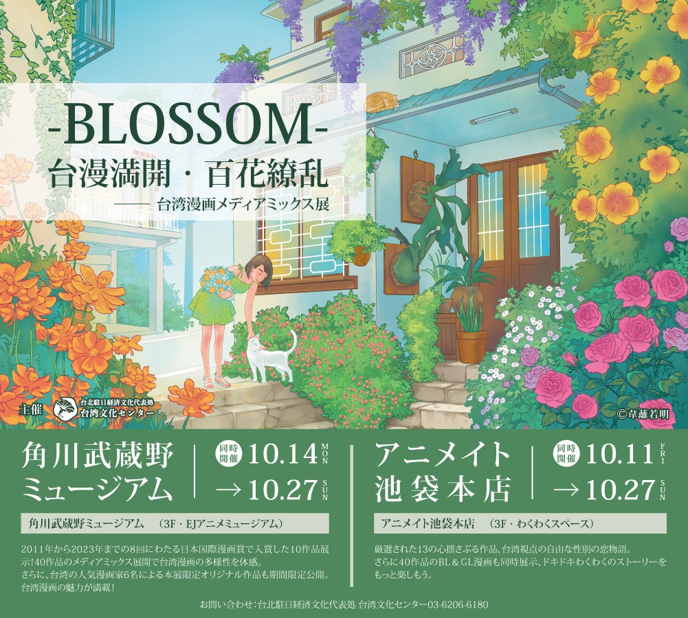 このように、日本における台湾漫画の新たな潮流をさらに広げ、多くの方々にその魅力をお届けするため、台湾文化センターは2024年10月に「角川武蔵野ミュージアム」と「アニメイト池袋本店」にて、台湾漫画イベント『-BLOSSOM- 台漫満開・百花繚乱』を開催いたします。