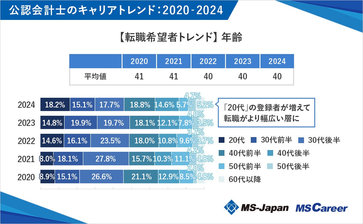 公認会計士の転職サービス登録時の年齢については、平均40歳で、昨年から横ばい、過去5年では若干若年化していることが明らかに。