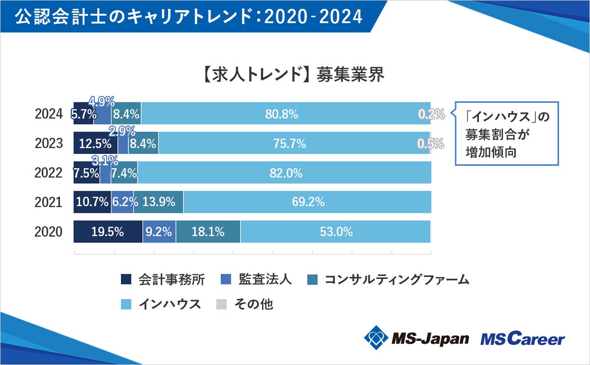 公認会計士の募集業界については、「インハウス求人」が過去5年で30ポイント近く増加し、2024年はインハウス求人が8割を占めていることが明らかになりました。