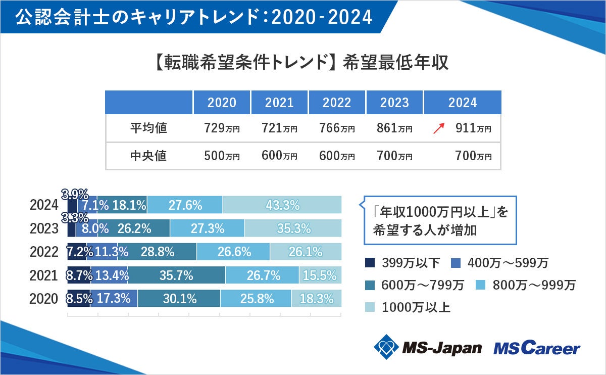 ・2024年の希望最低年収は、平均911万円(前年+50万)、中央値は700万