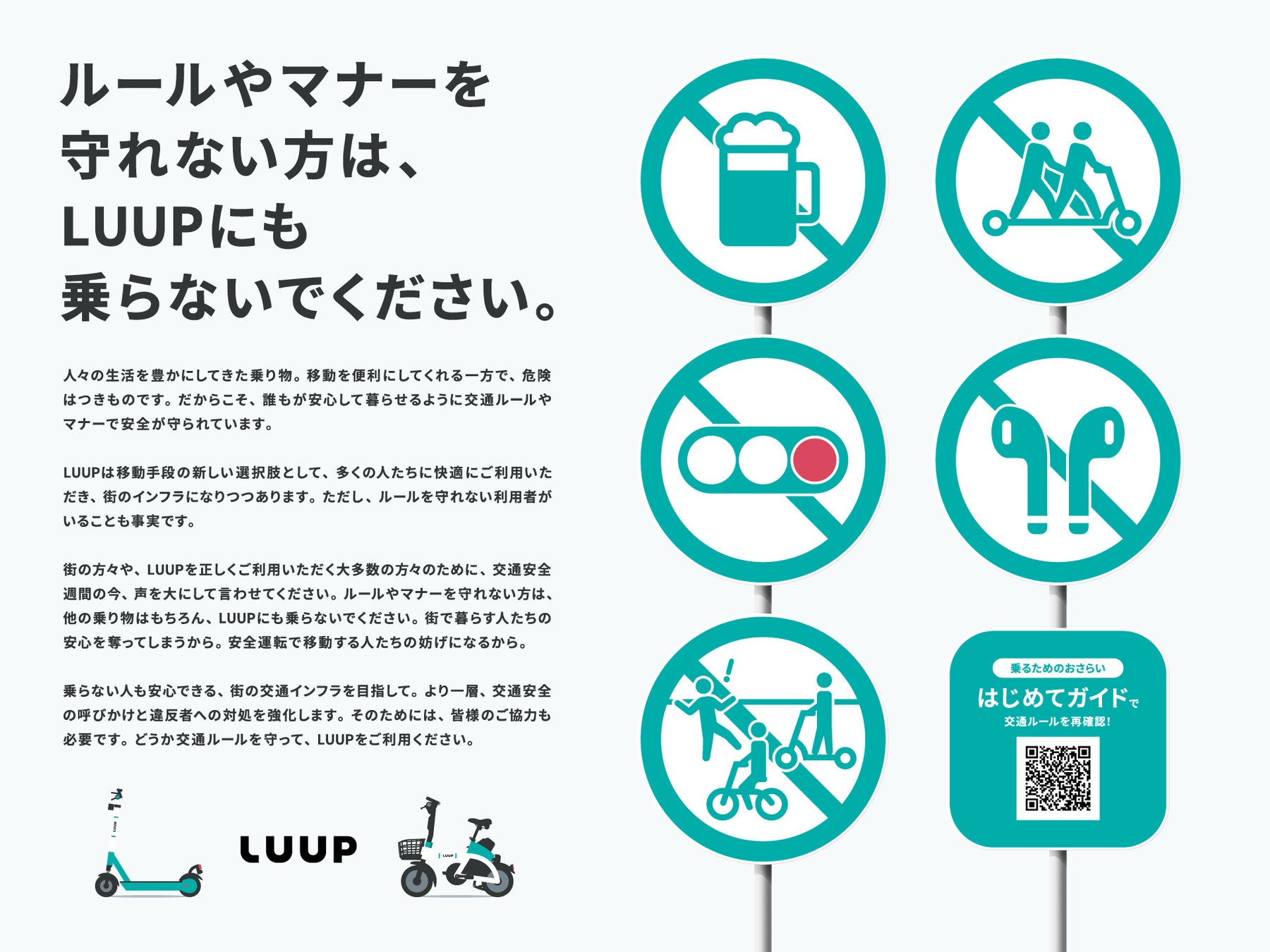 Luupは、移動手段の新しい選択肢、そして街の皆様に寄り添う交通インフラとしてサービスを提供していきたいと考えています。LUUPを利用する人も利用しない人も、誰もが安心して暮らせる社会の実現のために、より一層の安全啓発に取り組んでまいります。