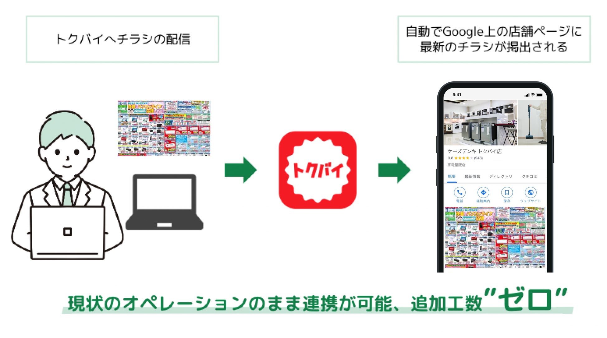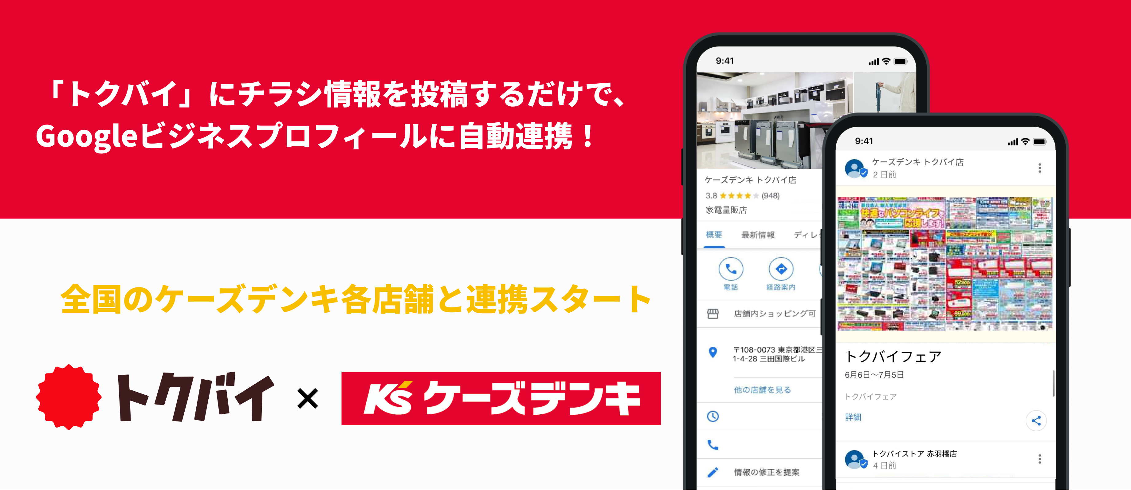 この度、株式会社ケーズホールディングスが展開する「ケーズデンキ」全550店舗に本サービスを導入いただきました。これによりケーズデンキは、「トクバイ」に入稿したチラシ情報を「Googleビジネスプロフィール」にも自動で掲載し、追加工数をかけることなく生活者へ最新の特売情報を届けることができるようになります。