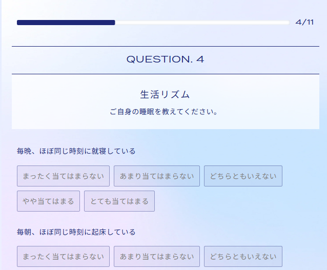 睡眠に関する自覚症状や睡眠習慣などの質問群を基に、睡眠状況を可視化する診断サービス。