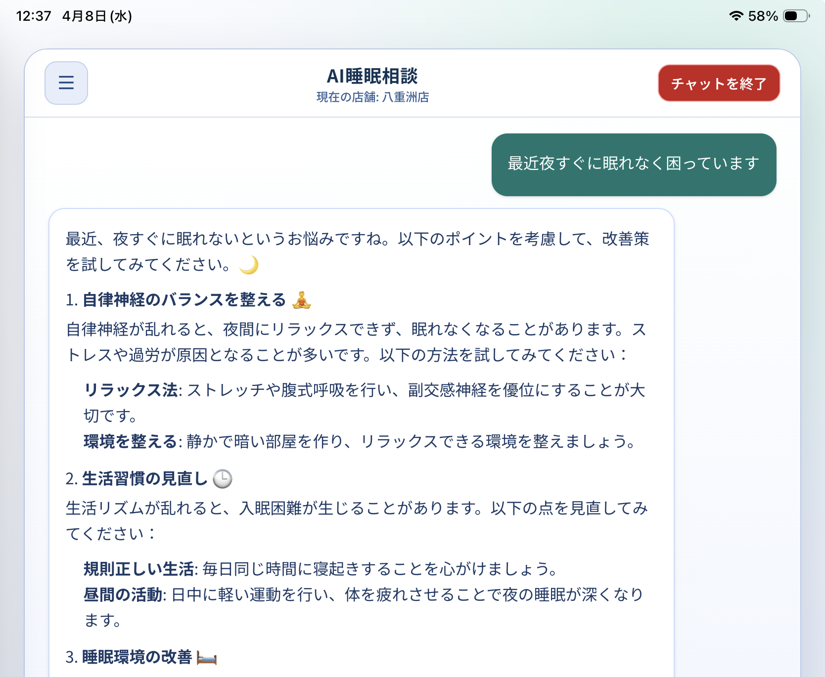 睡眠の専門知識を独自にAI学習した、AIチャットボットによる睡眠相談サービス。