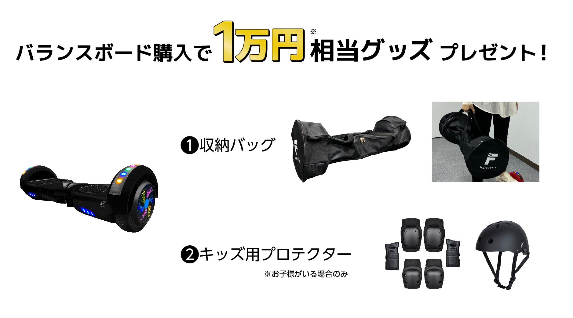 電動バランスボードをご購入のお客様には、10,000円相当の持ち運びに便利な収納バッグとキッズプロテクターをプレゼントいたします。