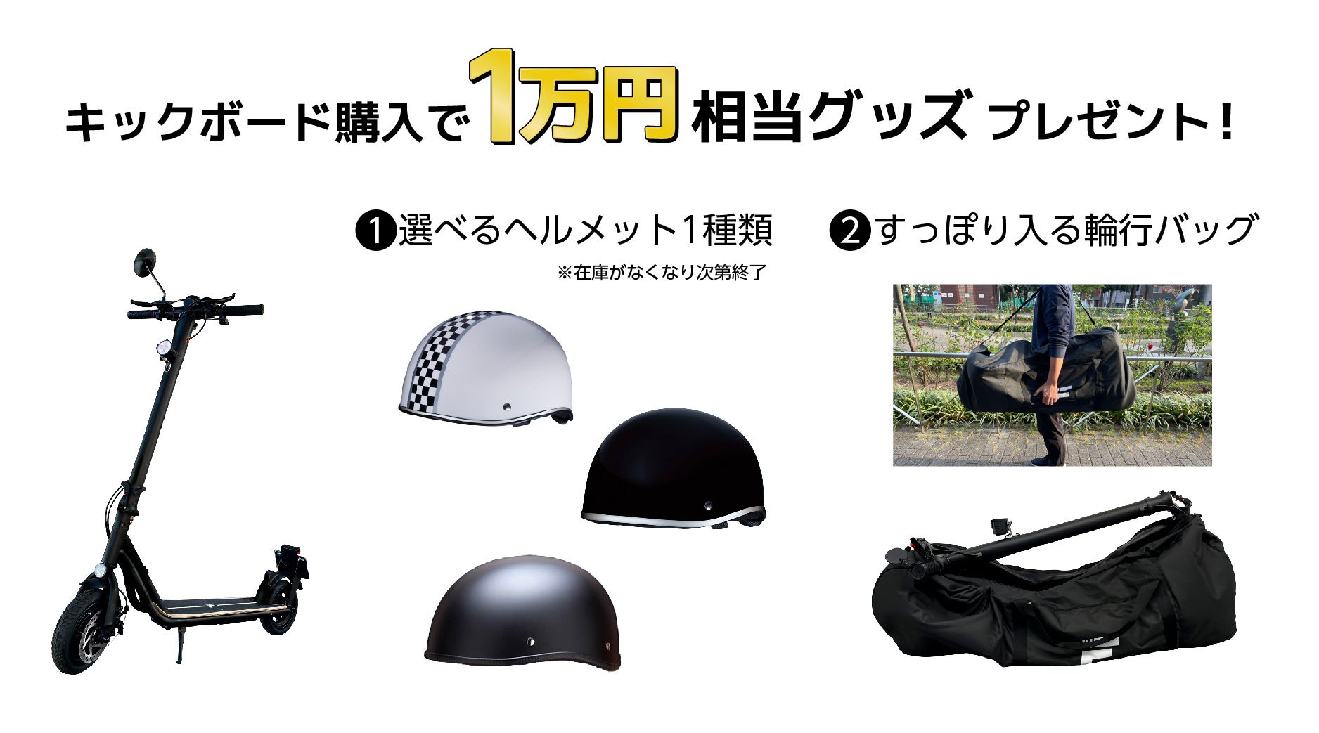 電動キックボードキックボードをご購入のお客様には、10,000円相当の3種類から選べるヘルメットと持ち運びに便利な輪行バックをプレゼントいたします。